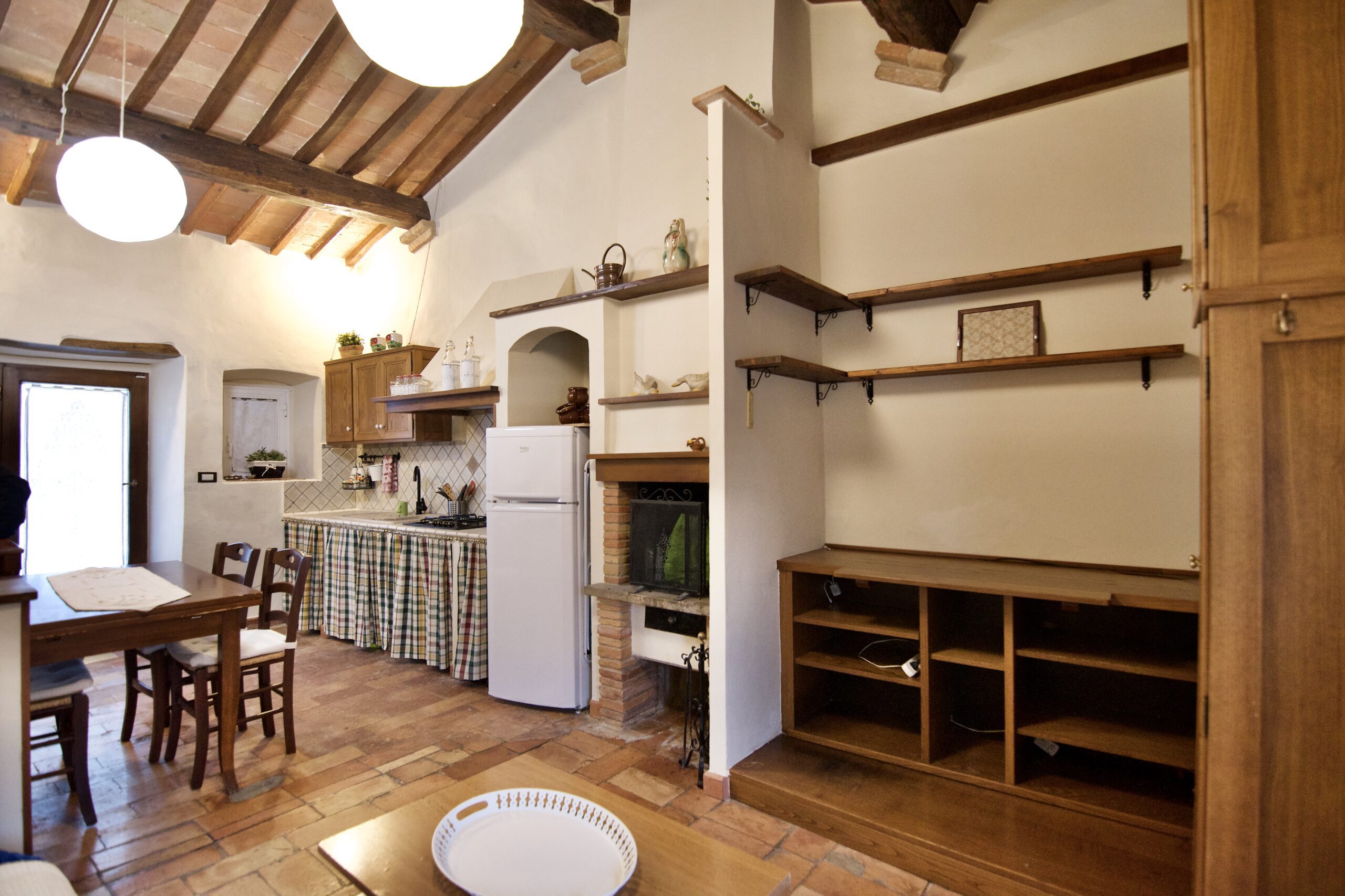 Ingresso in Openspace, uno spazio ben suddiviso per fornire una zona cucina, pranzo e un salotto con camino, grande finestra e numerosi scaffali.