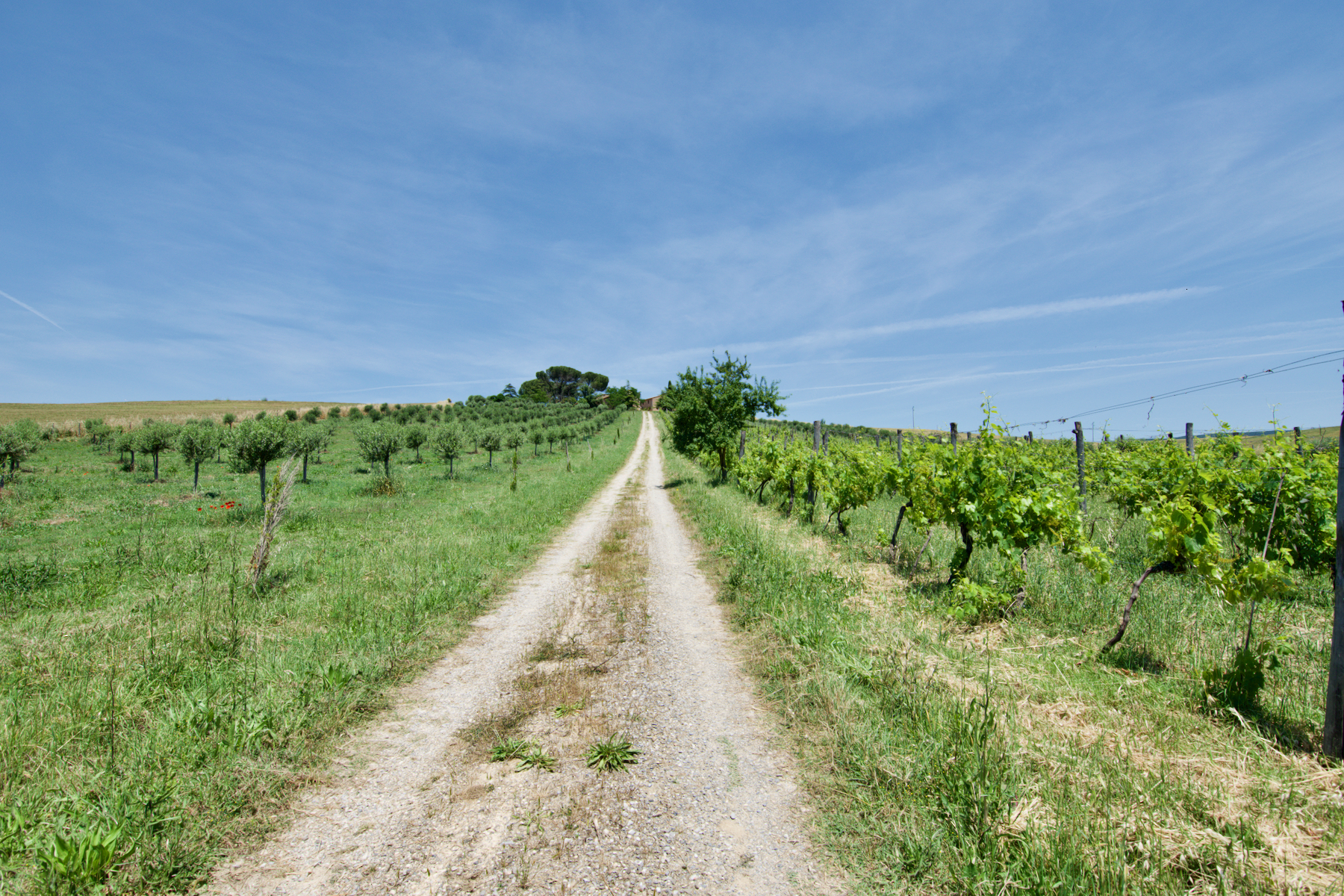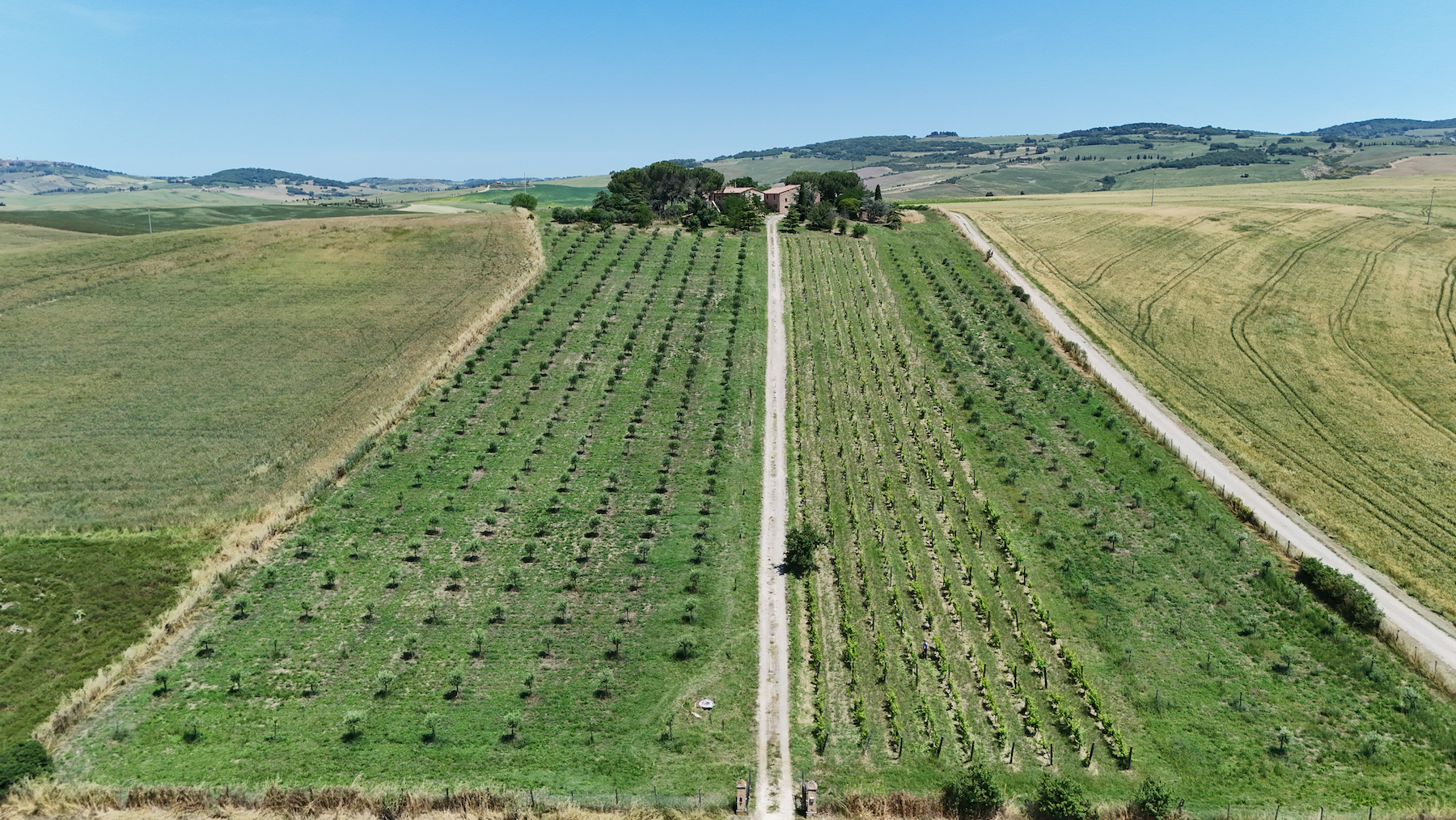 Quasi 3 ettari di terreno circonda la casa con il vigneto e l’uliveto che portano al fabbricato e un ampio spazio per il giardino circostante, sul retro con vista su Pienza e su entrambi i lati delle due ali con spazio e permessi per una piscina.