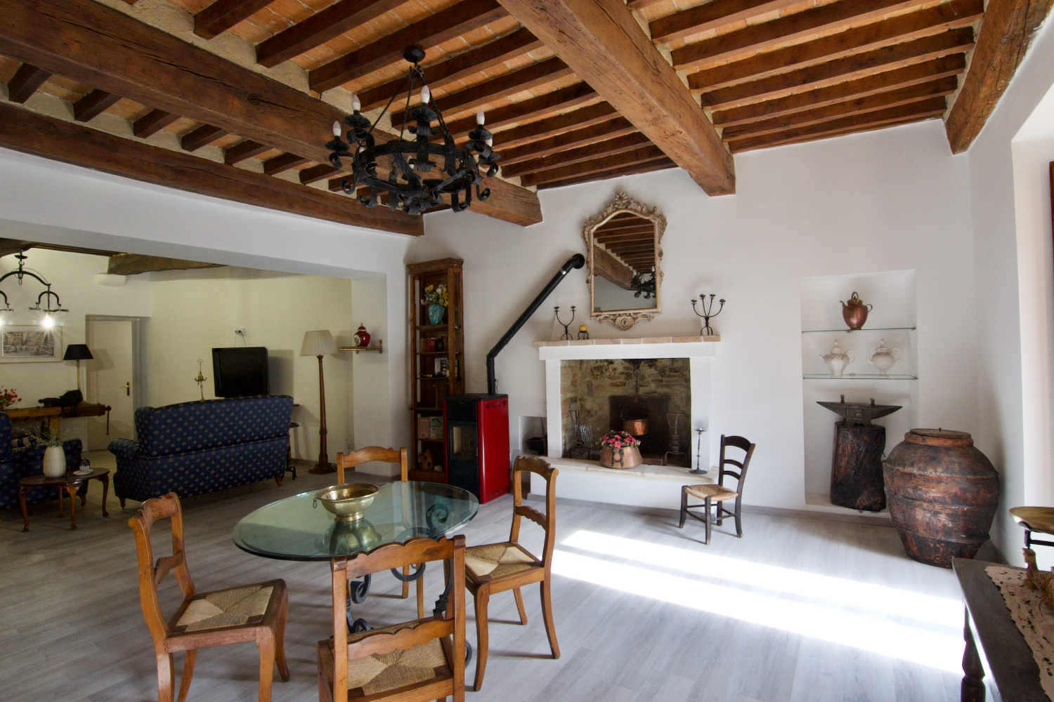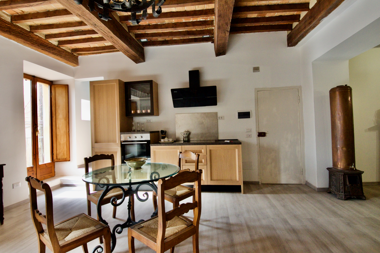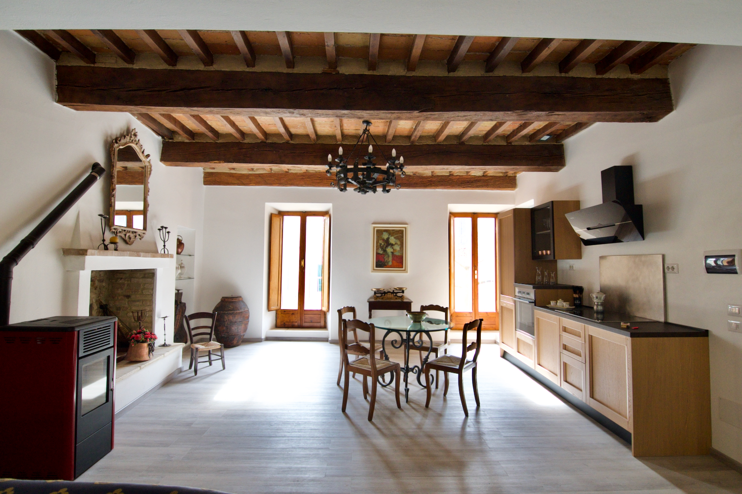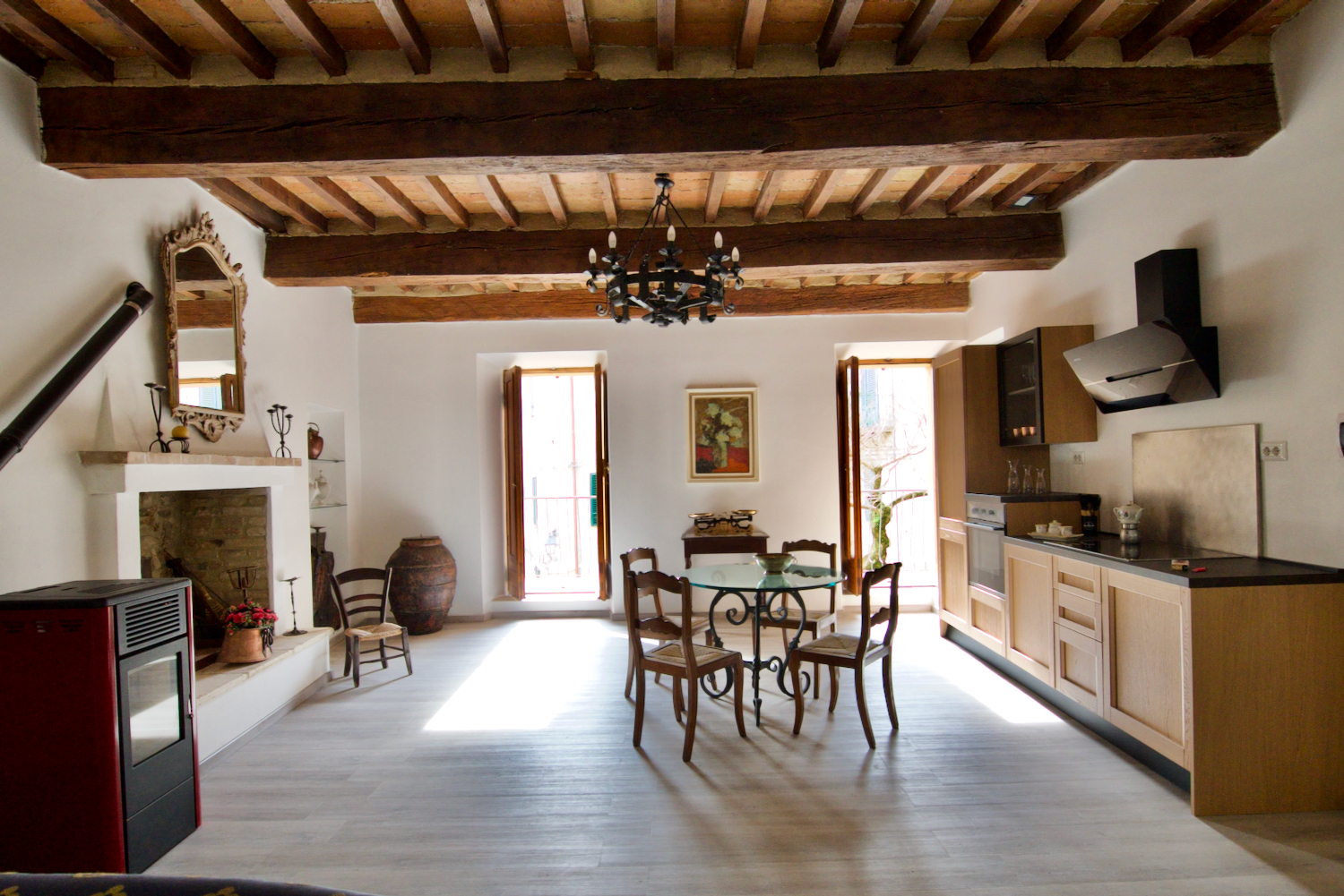 - Open-plan Living Room/Kitchen: Featuring a charming open fireplace, pellet stove, and French windows leading to a large balcony with stunning views of the square.