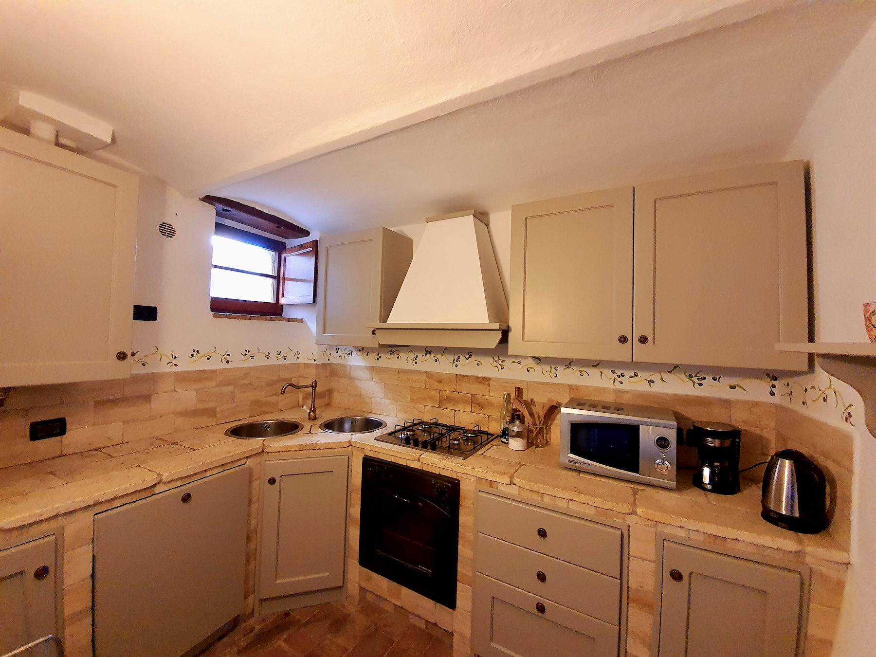 Kitchen- well equipped with double sink, dishwasher, gas hob and oven and travertine work surface