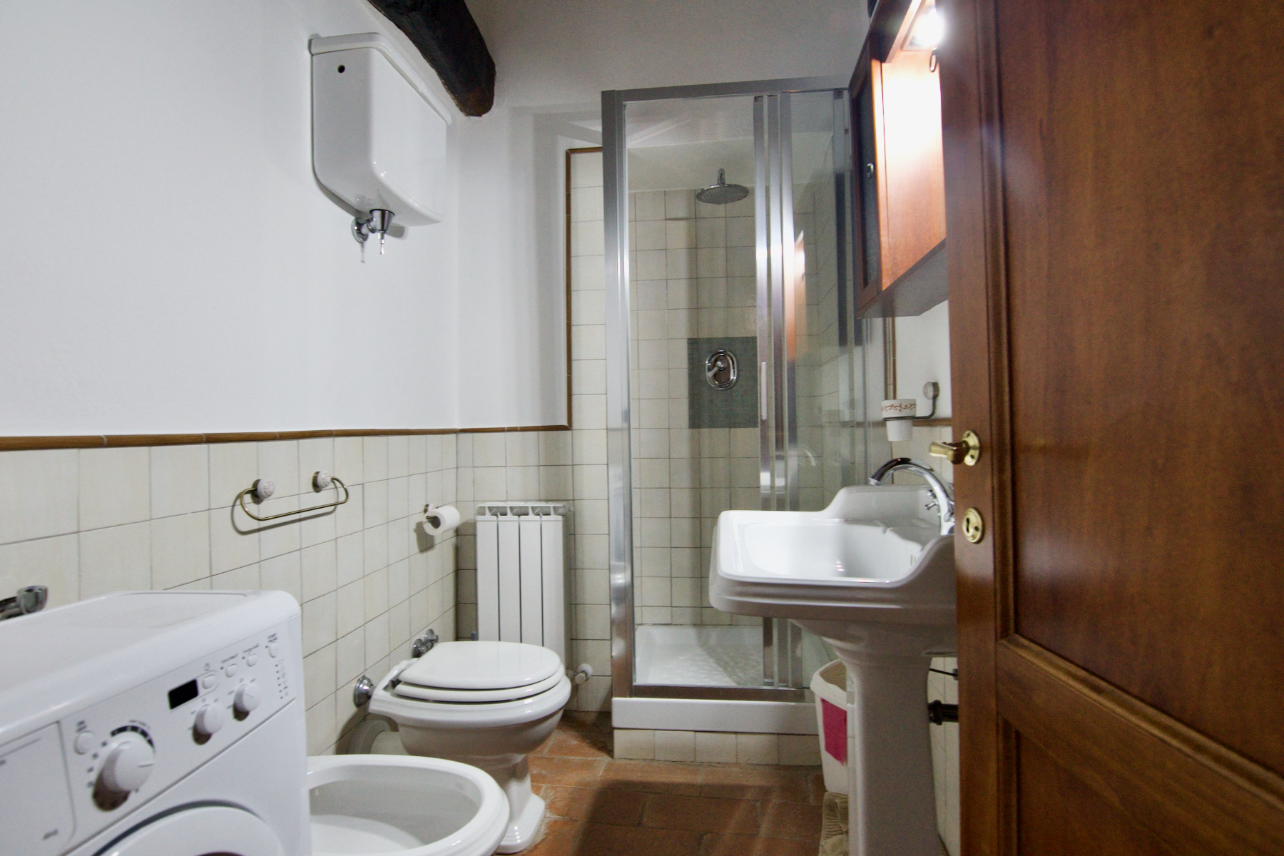 Bathroom with shower and washing machine.