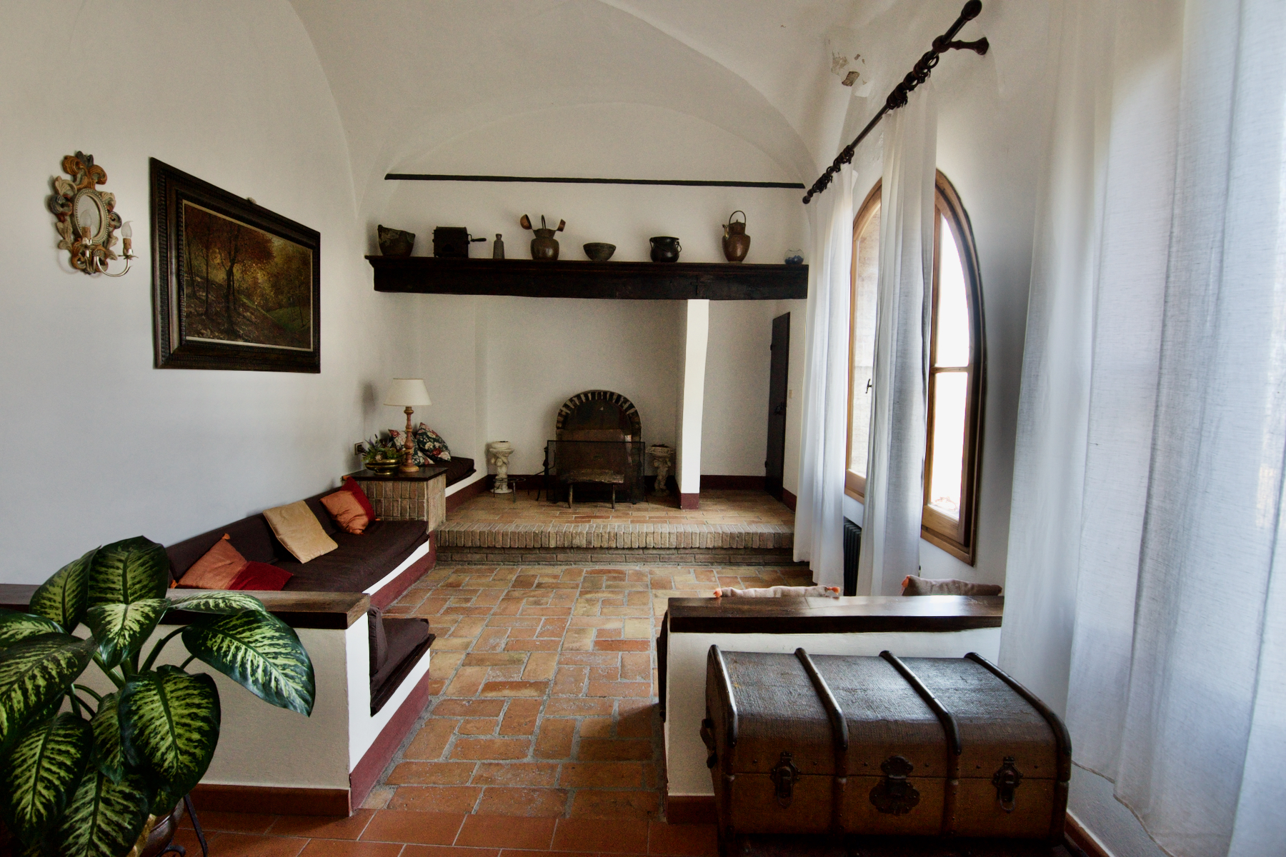 Long living room with an open fireplace